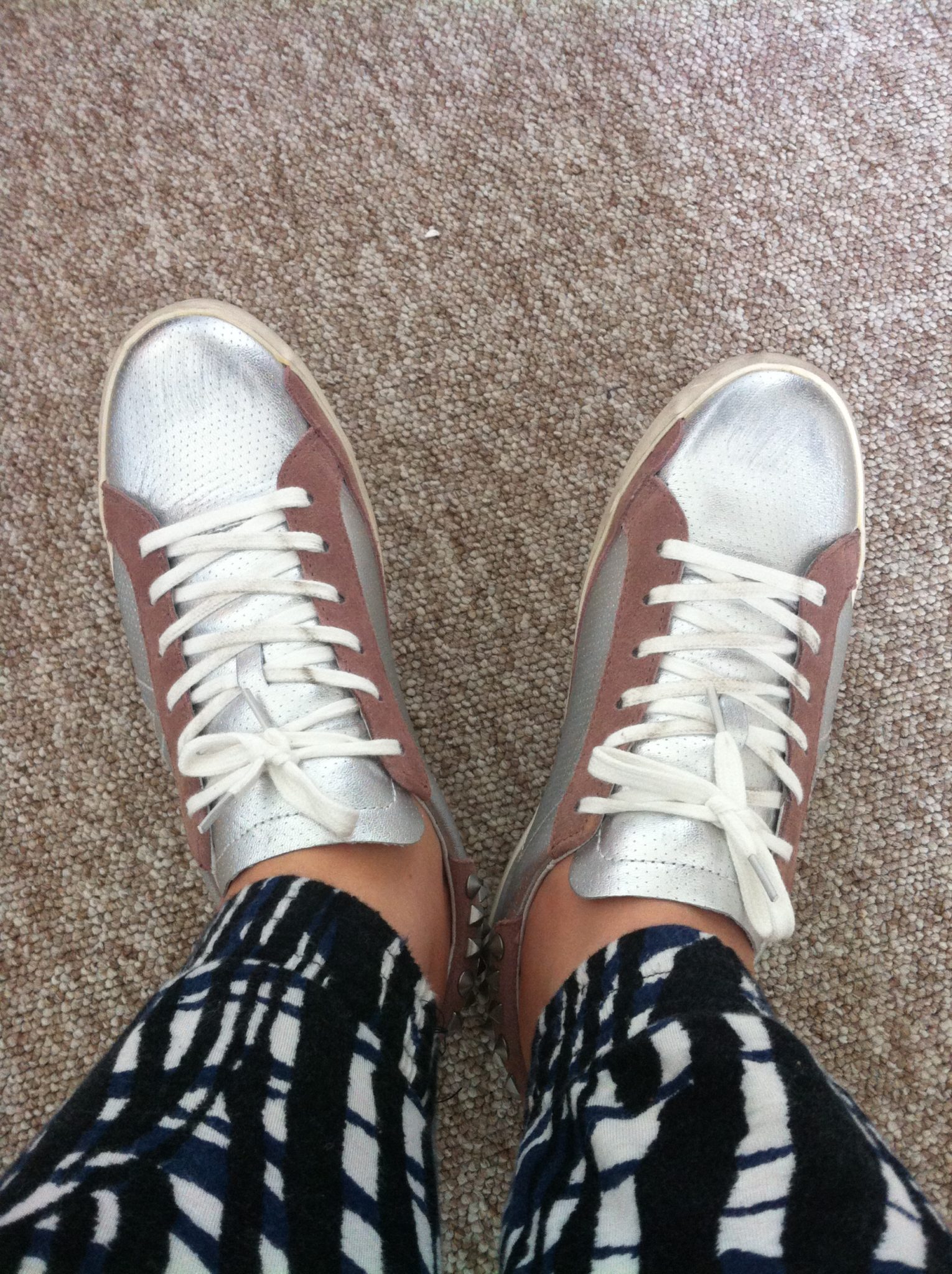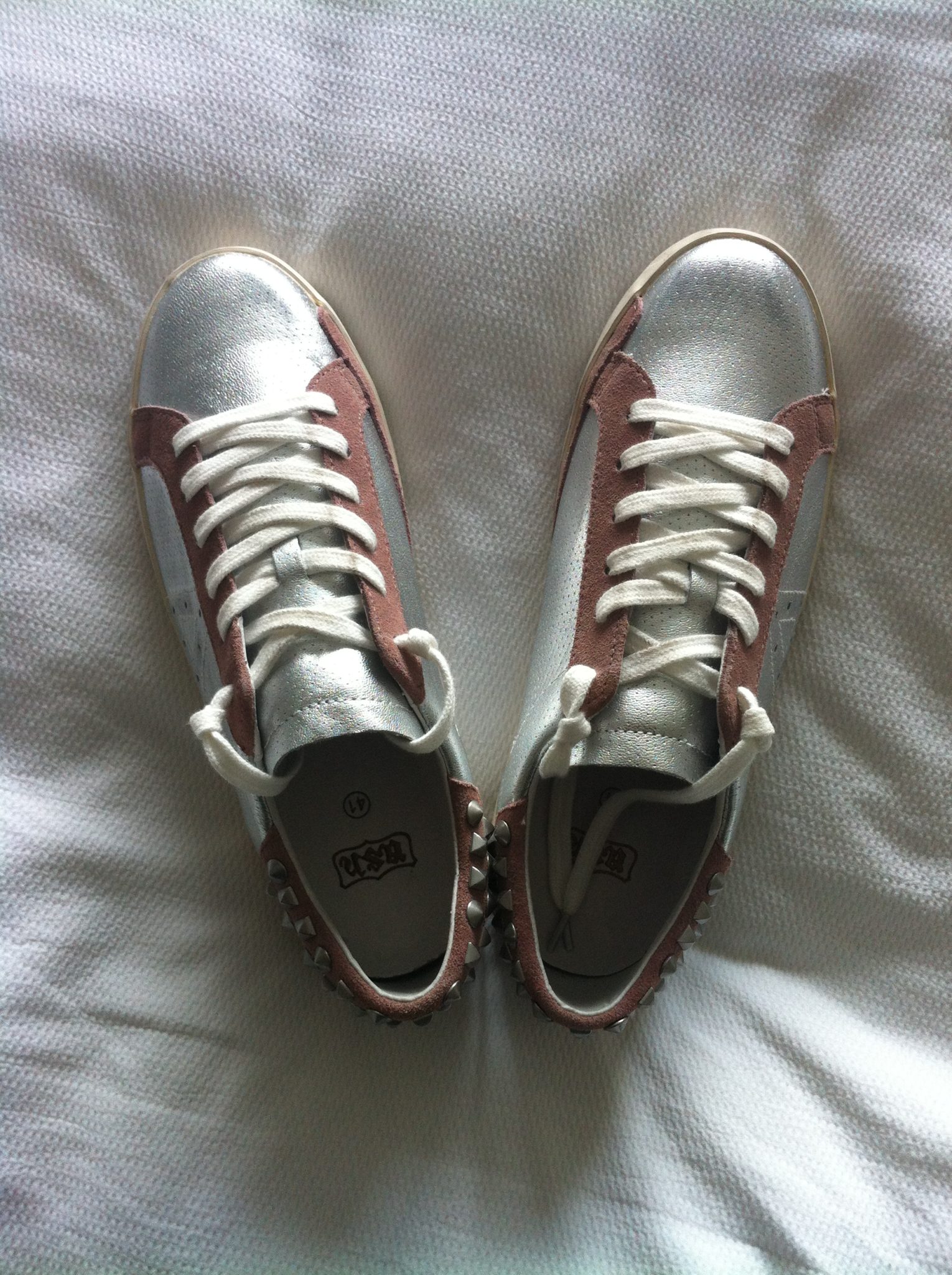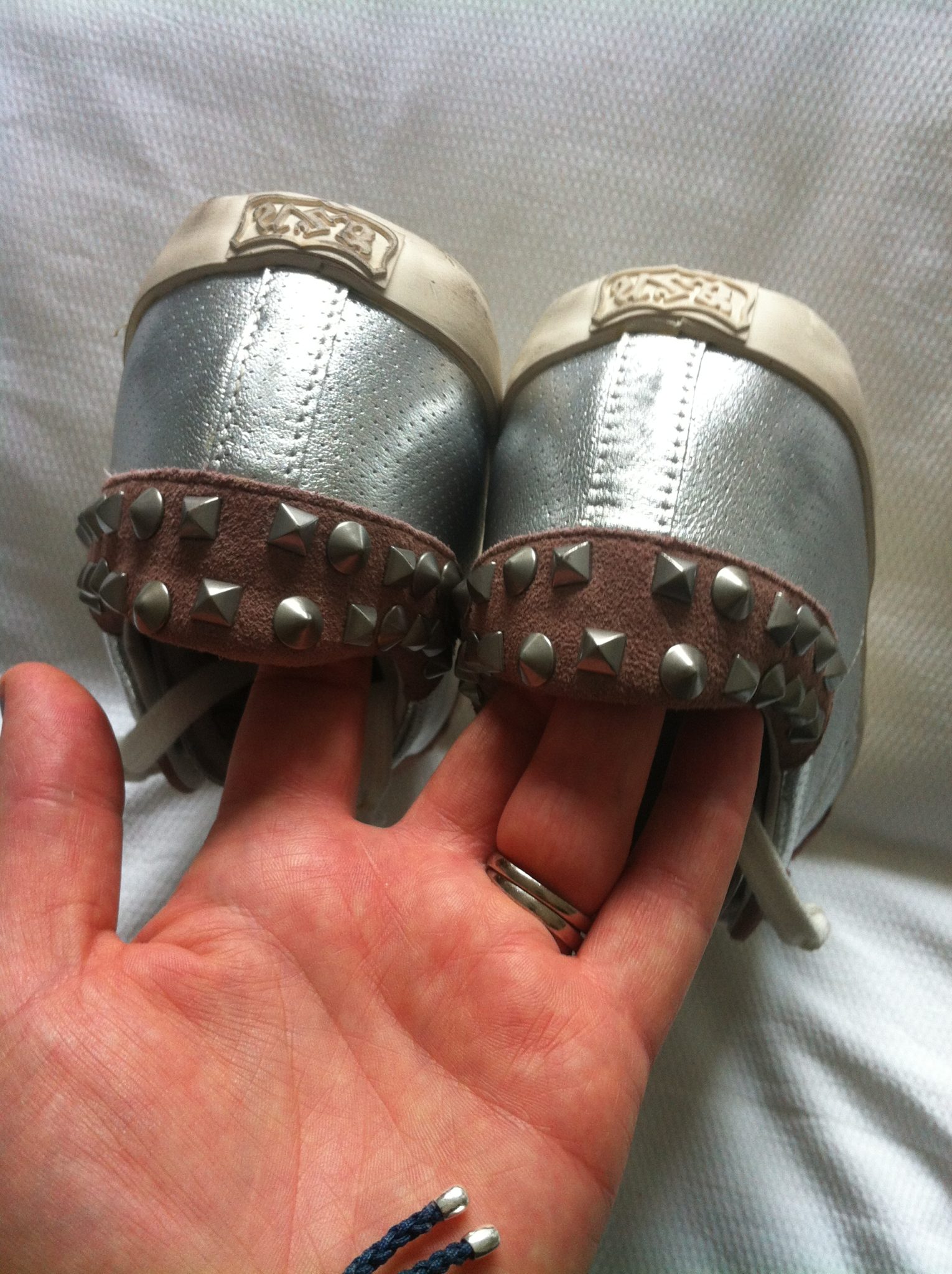 I cannot tell you the love I have for these leather sneakers. The rose suede trim, matte silver studding, metallic sports-luxe leather… the only thing I’m not sure about is the ‘pre-loved’ sole that has been discoloured/scuffed so they look worn in. To me they just look grubby, but hey-ho.