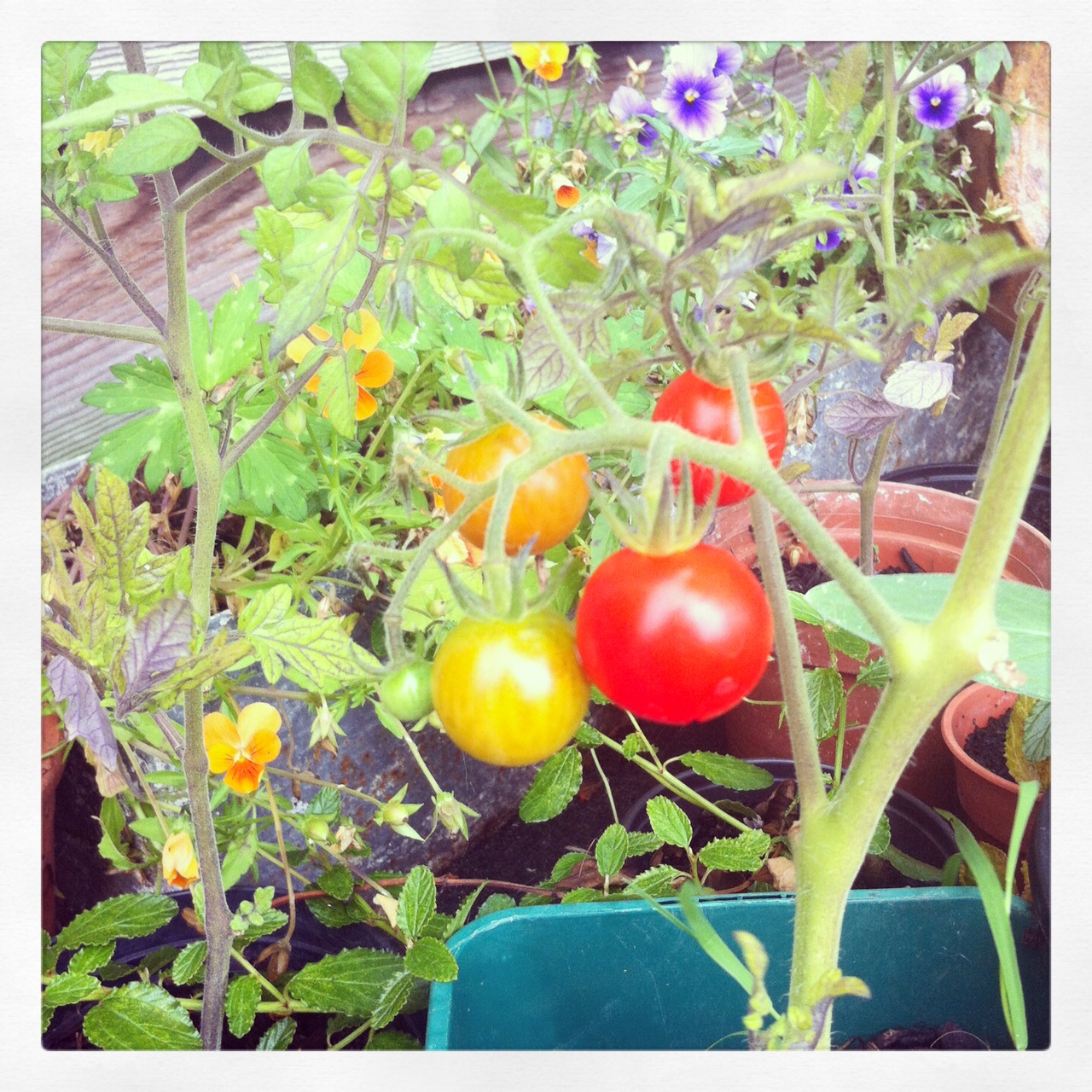 The cherry tomatoes are just ripening and the Williams pear and Cox Orange Pippin apples are bending the boughs with fruit: