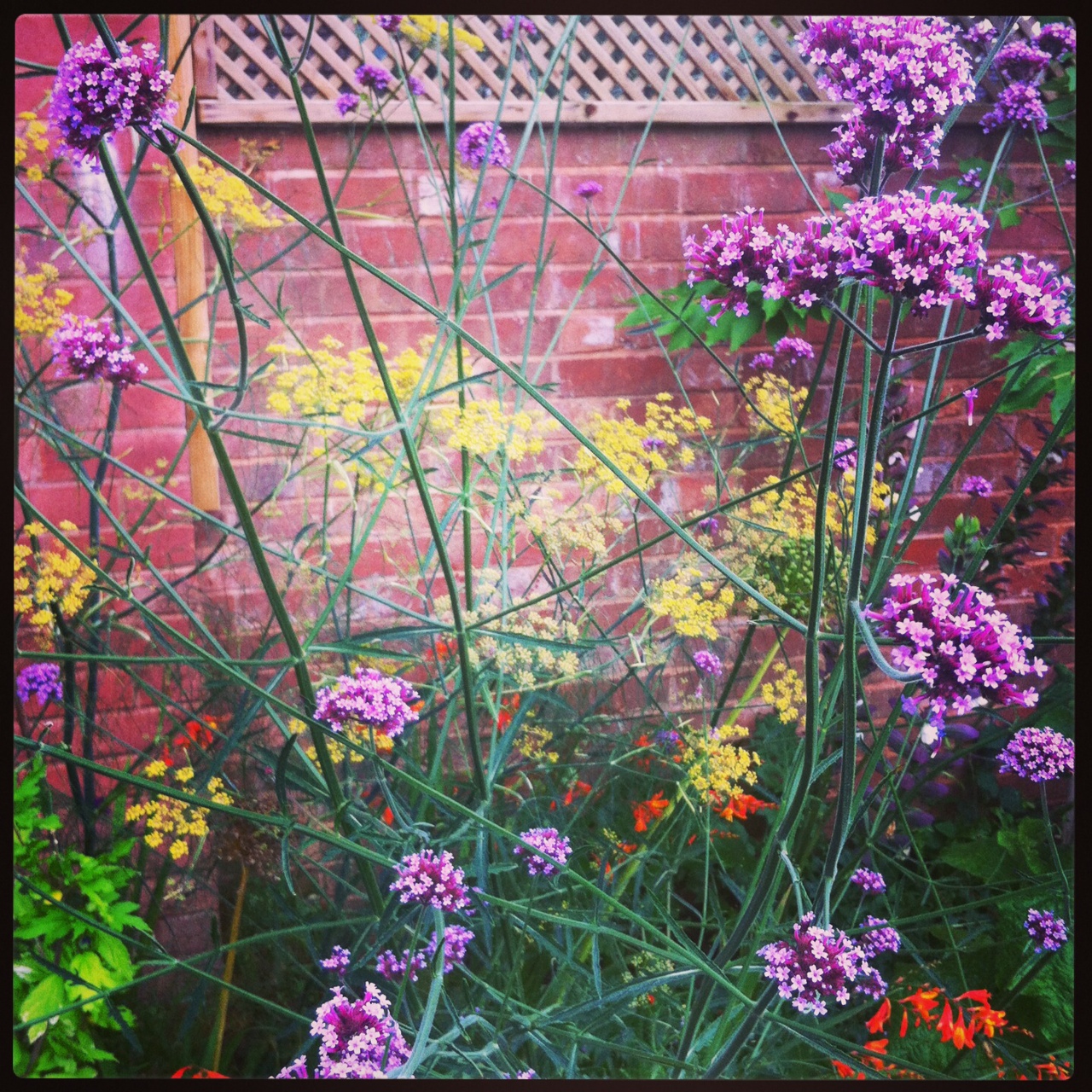 The biggest success has been the combo of fennel and verbena. Two more giants, I love the delicate yellow and wispy fronds of the fennel against the structural vibrant verbena. Great for the back of our 5ft deep bed.