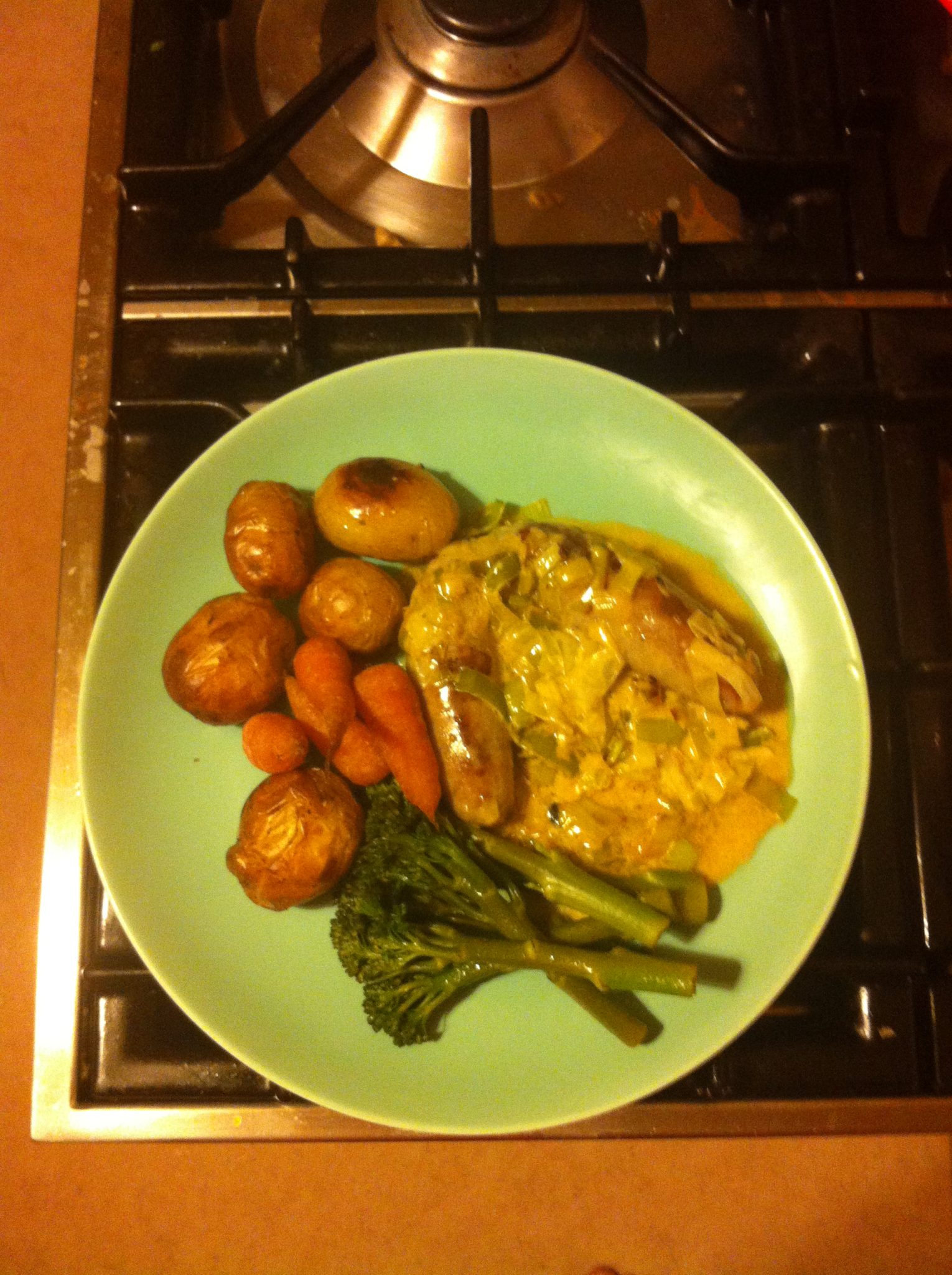 After 15-20mins the cream will have thickened and taken on the juices from the sausages and it will all feel like it’s hanging together. Now it’s ready to eat.