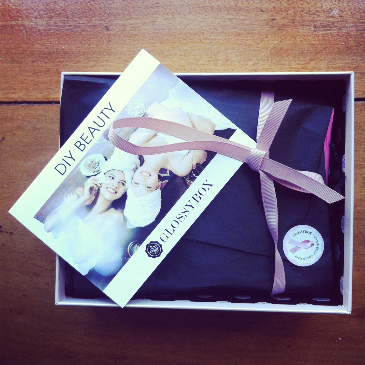 I did this series of shots so you could see how beautifully packaged the Glossybox is, it really feels like a gift, every month. I love the grown-up feminine (rather than overtly girly) blush pink and chocolate combo of grosgrain ribbon, tissue and minature shoebox.