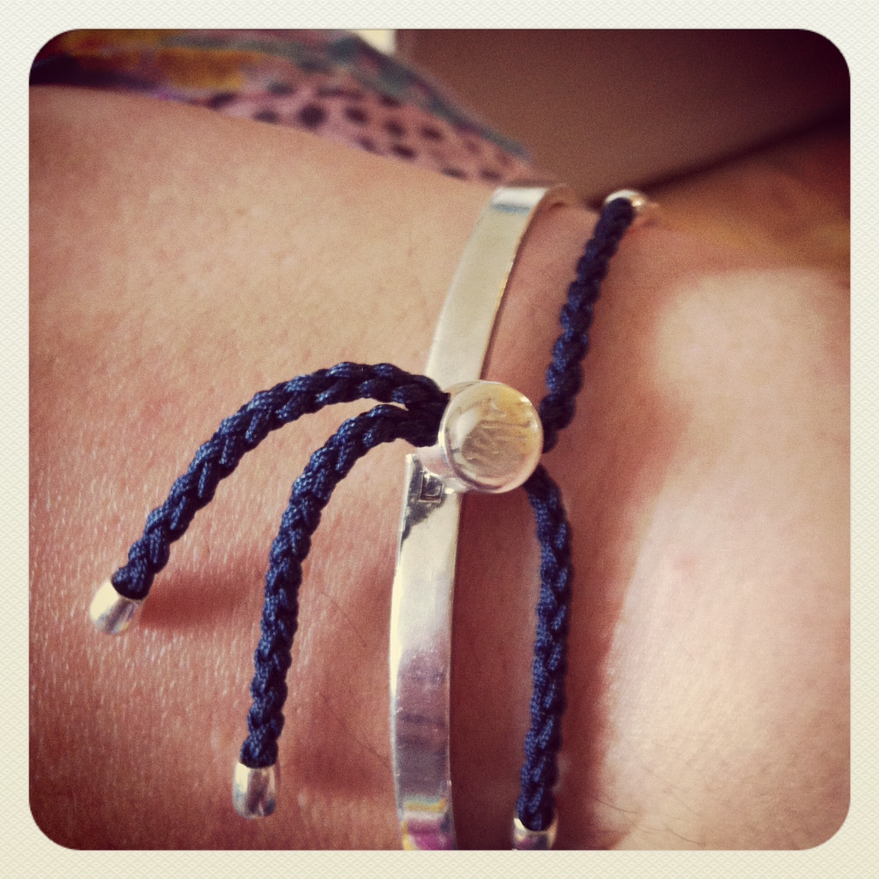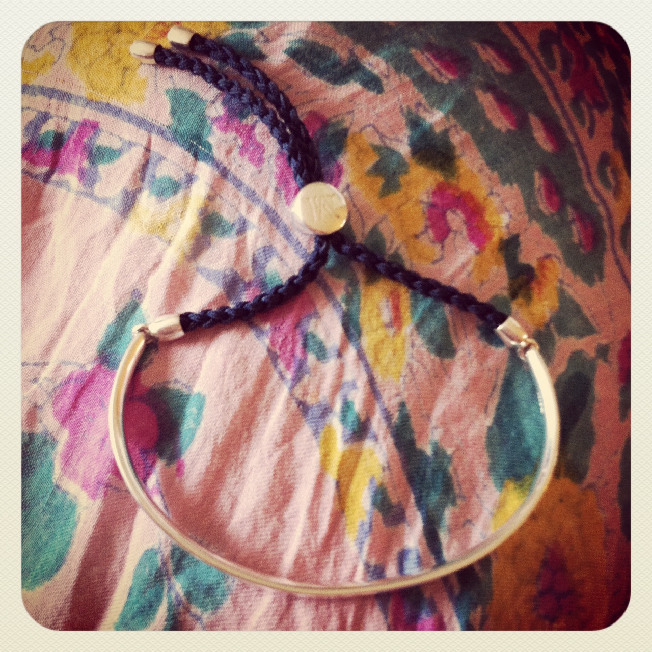 There are 11 colours to choose from, each represents a different symbolism – from Love to Hope, Health, Prosperity and my choice – Courage. After giving up our jobs, moving across the country and having a baby – courage seemed rather apt. Rather serendipitously, it comes monogrammed with an ‘M’, for Monica I presume, but in my case ‘Mansi’. The navy woven silk joins the simple, sleek sterling silver band.