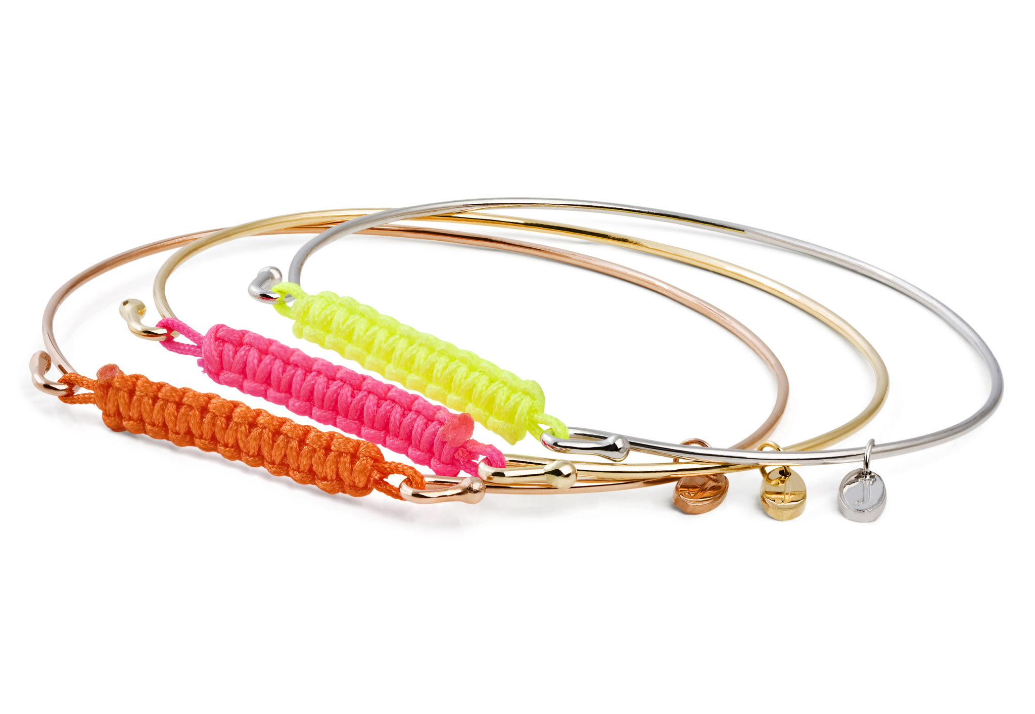 Rose, white and yellow gold bangles with neon orange, yellow and pink macramé fasteners by JADA Fine Jewellery, £240, kabiri.com