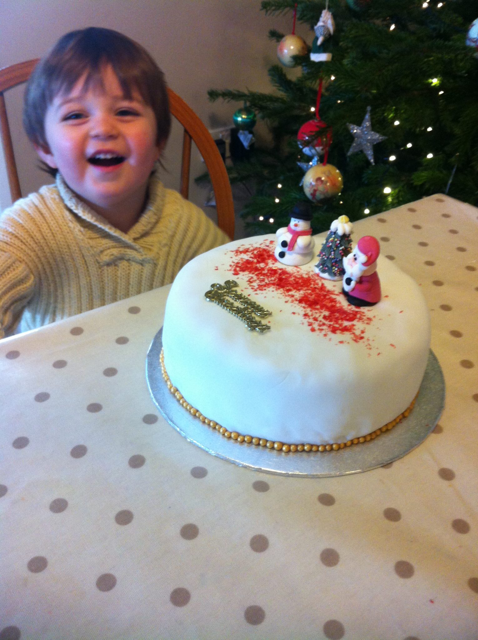 This photo does not even half convey the pride Country Bebe had for our Christmas cake. Although it was I who spent hours making it, feeding it and icing it, he was allowed to add the cake toppers and sprinkle the glitter (liberally) – so of course he got all the credit for ‘his Father Christmas cake’.