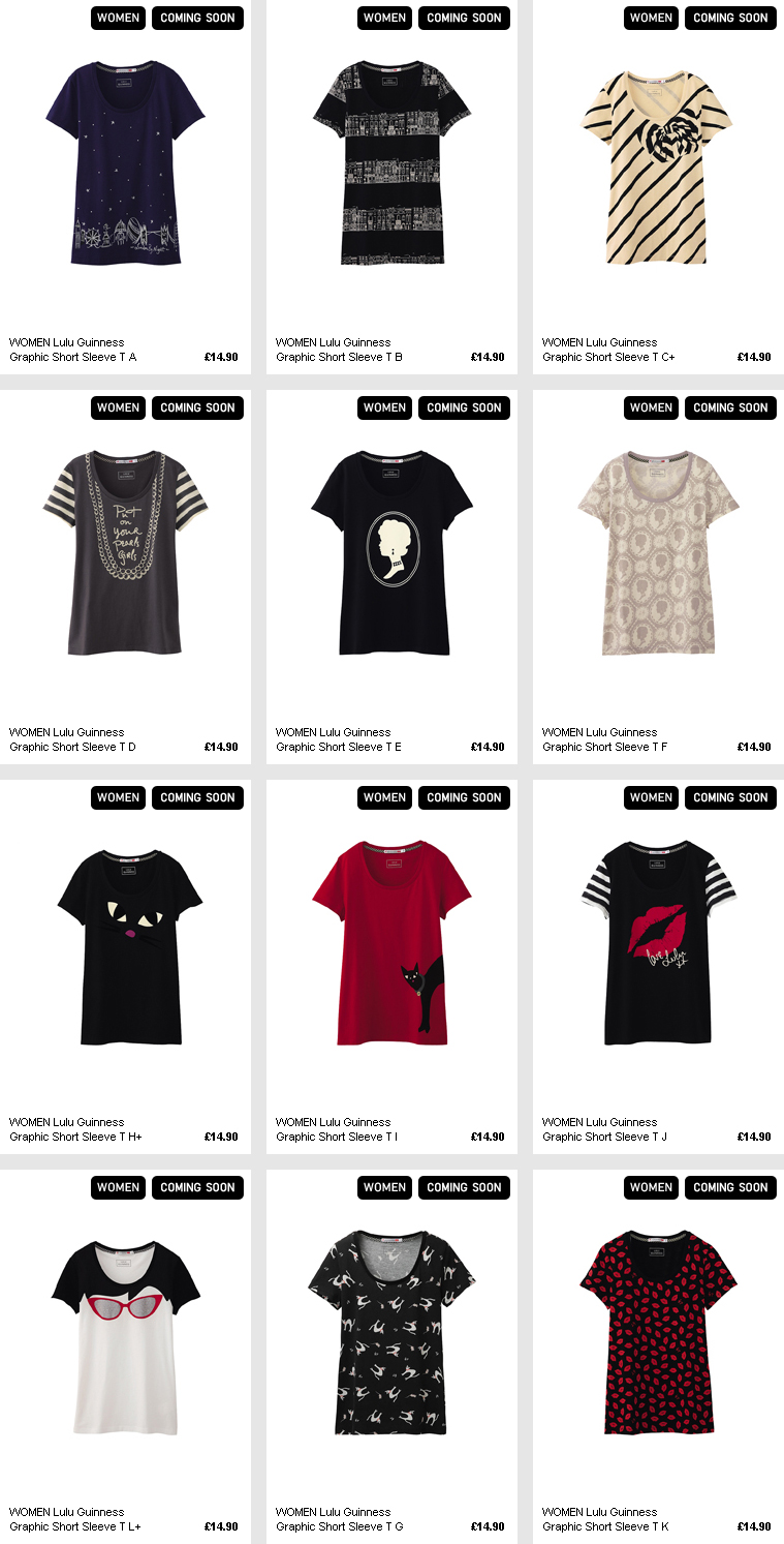 I will be setting the alarm to get online on the 16th and hopefully snap up the second from bottom trio of t-shirts from Lulu Guinness’ collection for Uniqlo. I usually avoid a graphic tee like the plague (big boobs don’t need adverts), but these bold iconic Lulu designs really are something special.