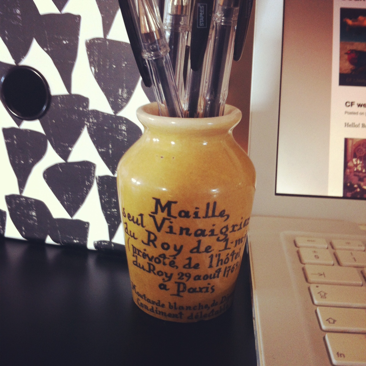 The great graphic magazine files (there are no drawers on the desk so I need space to store my ‘bumpf’) are £7 from paperchase and I have commandeered this antique Maille mustard pot for my pens.