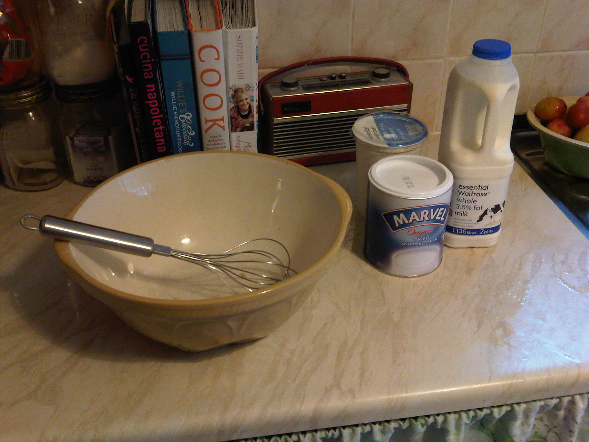 All it needs then is six good tablespoons of whole milk, live, plain yoghurt whisked into the milk (the aforementioned good bacteria). Wrap the bowl in clingfilm and tuck snugly away overnight in the airing cupboard, or the Yoghurt Incubator, as it has now been dubbed.