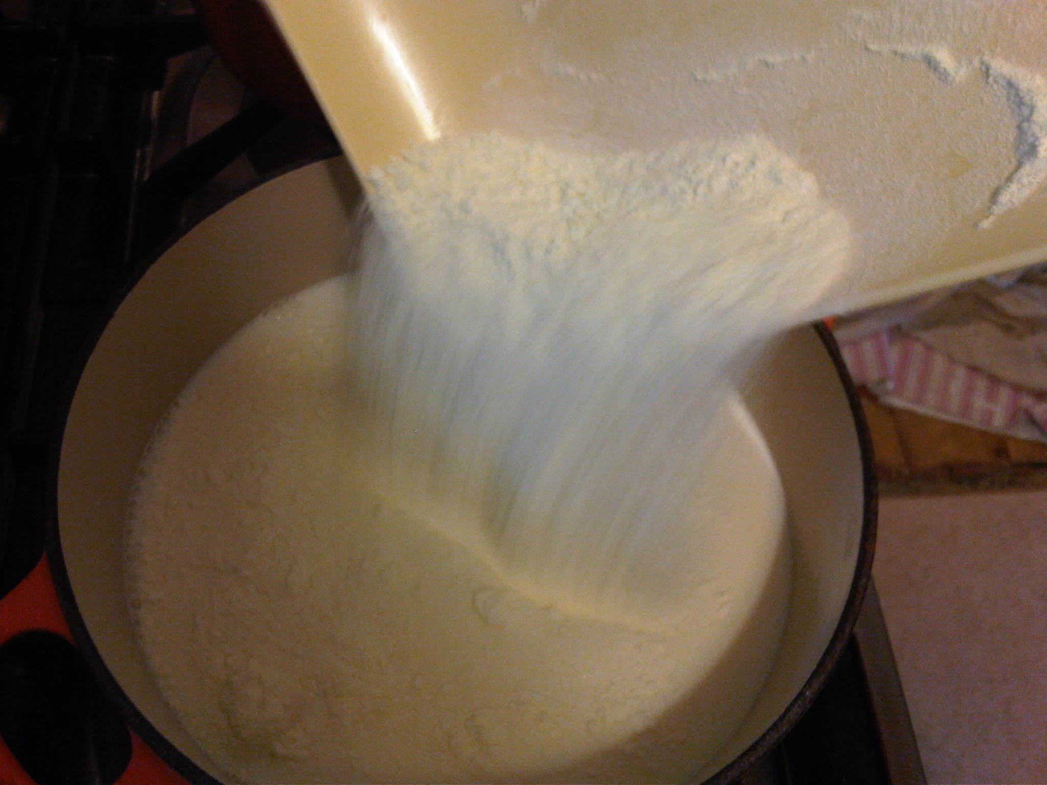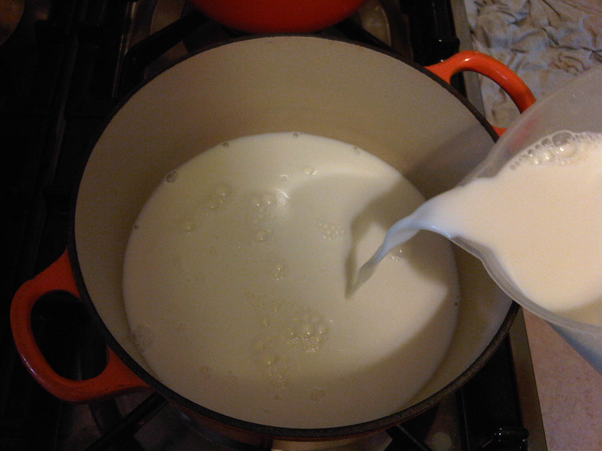 Into the pan went 2 pints of whole milk (none of this skimmed nonsense) with 50g of dried milk powder (for thickness says HFW) whisked in. It was then heated until little bubbles and a puff of steam appeared: