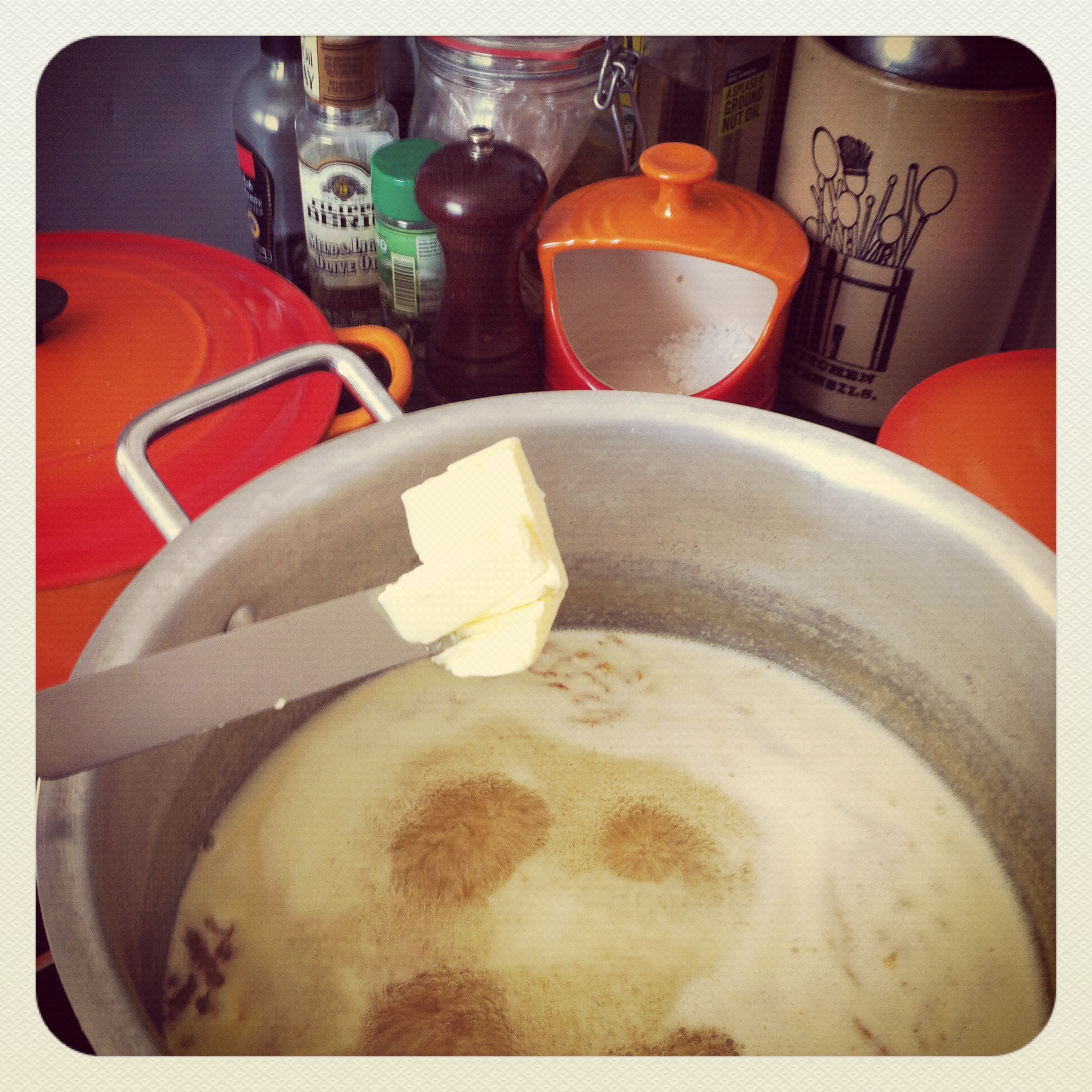 Once it’s on a rolling boil you’ll have a thick foam on top. Add a knob of butter to disperse the foam and turning down the heat. It needs another 15 mins at a slightly slower boil, stirring occasionally.
